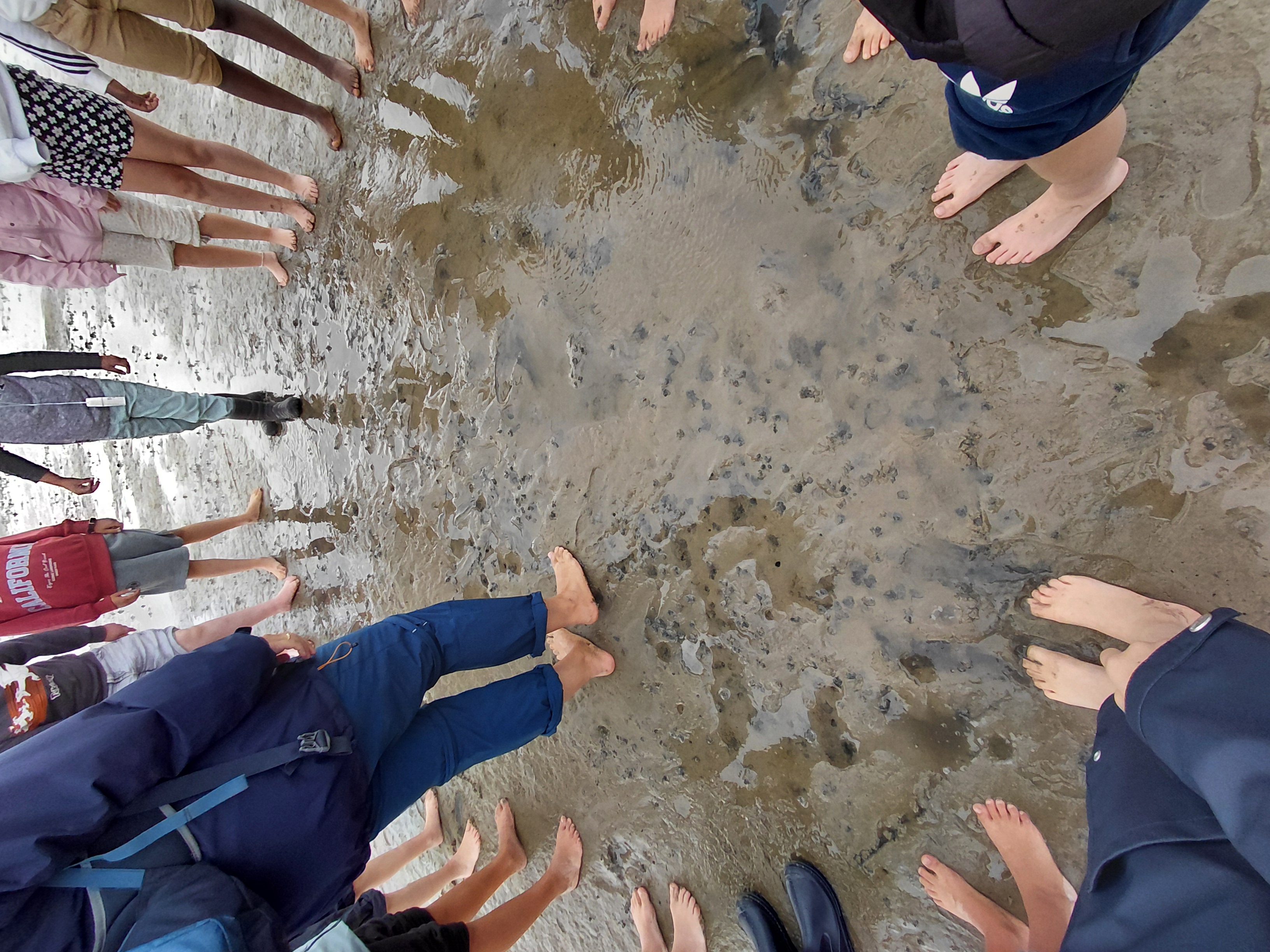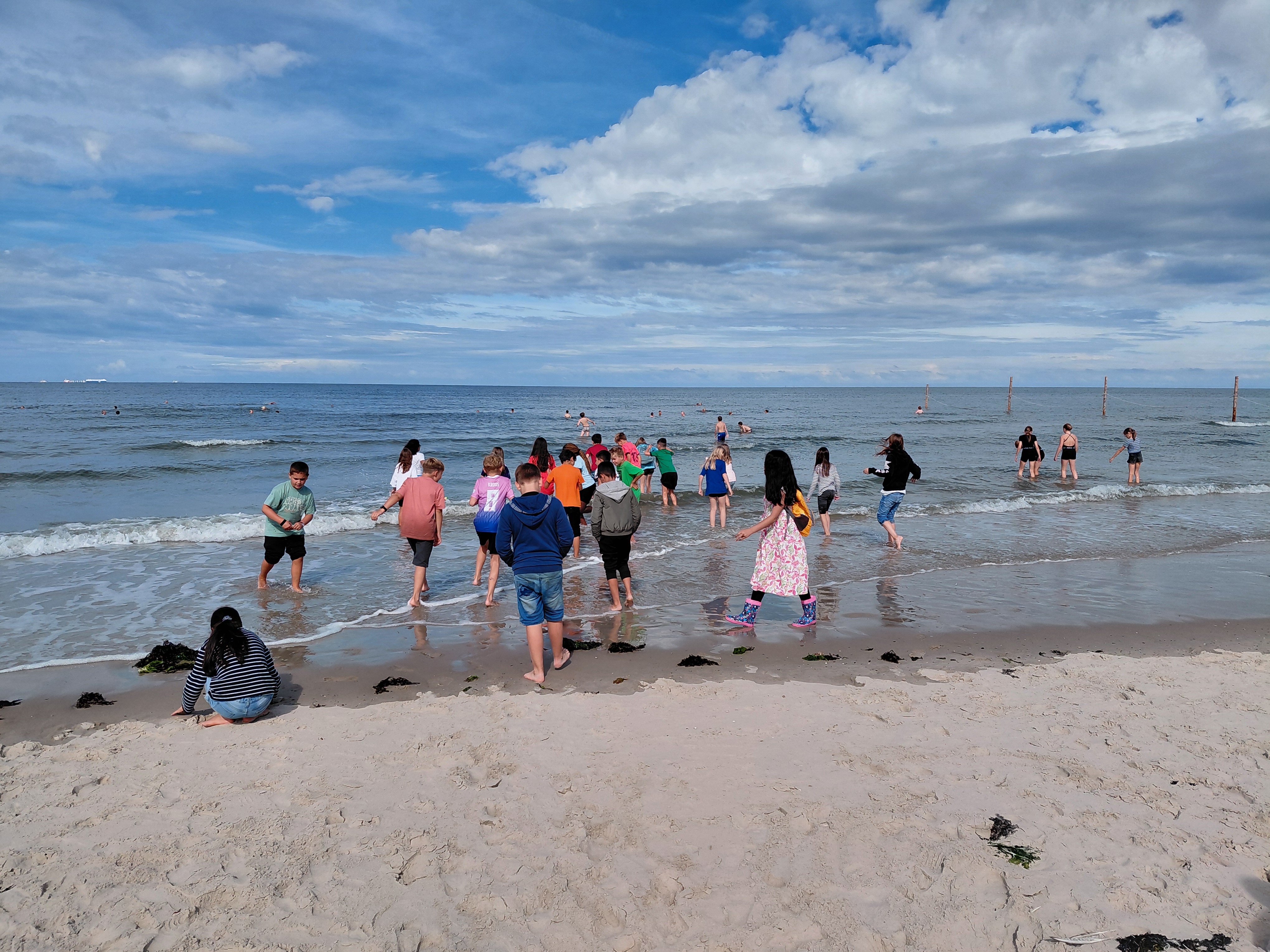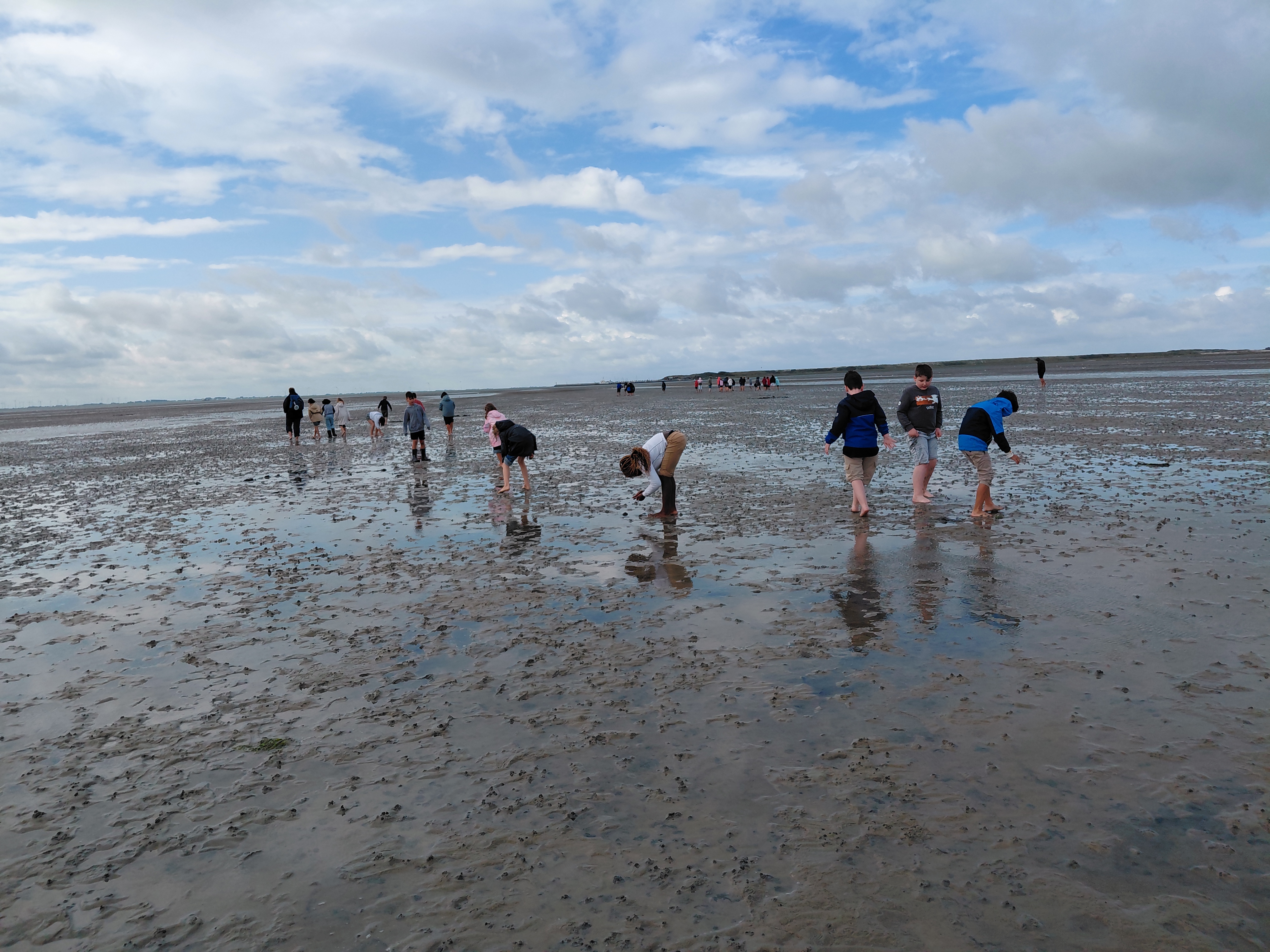 Den Abschluss bildete eine Wattwanderung. Mit nackten Füßen liefen alle über den Meeresboden und suchten Wattwürmer, Wattschnecken und versuchten, wie die Möwen die Herzmuscheln an die Oberfläche zu bewegen. Hier blieb nicht jedes Kind trocken… 😊
